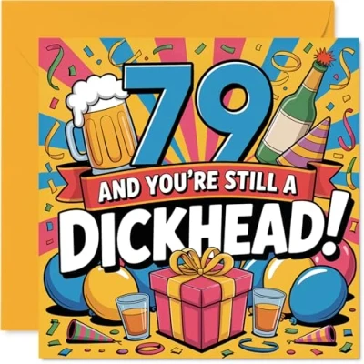 Ideal for adding a cheeky twist to the celebrations, the bold '79 AND YOU'RE STILL A DICKHEAD!' line gives everyone a reason to chuckle. Birthday card with a light-hearted design style Features vibrant party motifs including colourful balloons and drinks set against a punchy yellow background, making it a true standout. Recyclable and printed in UK for a considerate choice Printed on glossy single sided board with an uncoated inside. No smudging when writing inside. Made with FSC board and fully recyclable. Printed on 360 micron stock for a confident, premium feel Blank inside, so you can personalise your own message. Comes with an envelope for easy gifting. The 145mm Square format is convenient to display or post Designed to bring a smile with quality you can trust-perfect for anyone who appreciates humour and a splash of colour. Ideal for a mum or dad celebrating a milestone birthday
