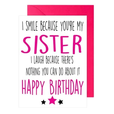 Funny birthday card for your sister with a cheeky message Perfect for siblings who love humour and banter 5x7 premium card printed on high quality stock Blank inside for your own message Supplied with envelope and packaged to arrive safely