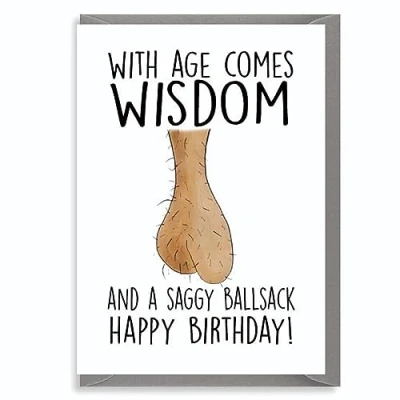 Outrageously funny card for the bloke who’s ageing like a fine (slightly wrinkled) wine Features the message: 'With Age Comes Wisdom… And A Saggy Ballsack' Perfect for birthdays, banter and midlife meltdowns – not suitable for Nan Blank inside for your own comedy gold, brutal roast or saggy sympathy Printed on 280gsm card with a coloured envelope – made with wicked humour
