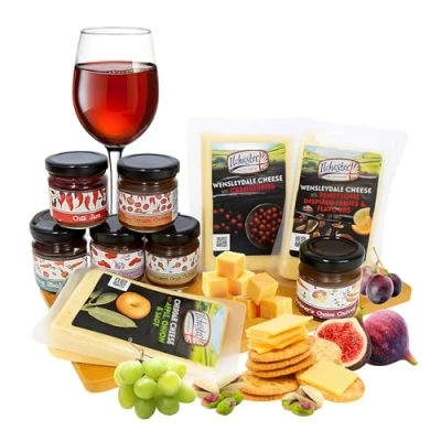 Cheese Wedges, Chutney & Cheese Board Gift Set – The Perfect Gourmet Gift for Every Occasion: discover the ultimate treat for cheese enthusiasts with the Chutney & Cheese Selection for Gifts. This beautifully curated set includes three delectable 150g cheese varieties— Wensdale with Panettone inspired fruits and flavours; Wensledale with Cranberries, and Cheddar with Onion and Sage—paired with a stylish cheese board for serving and 6 x assorted Mini Jars Chutneys. Ideal for holiday celebrations, cosy nights in, or as a thoughtful gifts for couples, this set is perfect for creating memorable moments with loved ones. A Thoughtful and Versatile Gift: this cheese gift set is thoughtfully packaged, making it an excellent choice for Christmas gifts, food hamper, Birthday gifts or simply showing someone you care. Perfectly suited for couples, this set encourages sharing and indulging in life's simple pleasures together. From cheese connoisseurs to casual snackers, anyone who appreciates high-quality, delicious cheeses will love this gift. Its versatility also makes it a standout choice for holiday gift exchanges or corporate gifting. A Trio of Irresistible Flavors: each cheese wedge in this collection is crafted to delight the palate. A creamy and slightly crumbly Wensleydale cheese blended with juicy red cranberries, a rich Wensleydale infused with zesty mandarin and warming ginger flavors and a smooth, mature cheddar enhanced with the savoury sweetness of apple and onion, finished with aromatic sage. Pair your cheeses with 6 x 35g mini selection of chutneys – including Caramelised Onion, Potting Shed Pickle, Gardener’s Choice, Hot Spicy Tomato, Chilli Jam and Sun-Dried Tomato & Smoked Garlic Chutney. Whether you prefer something sweet, smoky, or spicy, there’s a flavour for every palate. Build your cheeseboard your way – add crackers, grapes, charcuterie, or a drizzle of honey for a stunning centrepiece that’s perfect for entertaining, picnics, or cosy nights in. Ideal for cheese tasting evenings, food hampers, or thoughtful gifts for friends and family. Celebrate the Season with Style and Flavour: the Cheese Gift Set is more than just a gift—it's a celebration of good taste and togetherness. Whether you're surprising a loved one or treating yourself, this set turns any moment into a special occasion. With its combination of premium cheeses and a chic serving board, it’s a timeless gift that embodies the joy of sharing delicious food with others. Bring home the perfect blend of flavour, convenience, and elegance this holiday season.