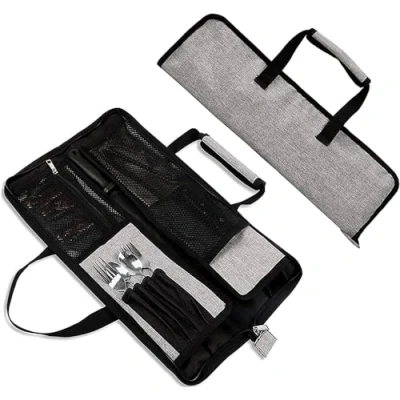 LARGE CAPACITY FOR CHEF KNIVES: Measuring 18" W * 11" H (46 * 29 cm), this chef knife bag accommodates up to 12 knives and utensils. Zippered pockets ensure organized storage, and its compact roll design allows for secure transportation. QUICK AND EASY STORAGE: Its ergonomic design allows for effortless organization in your knife bag. Two mesh pockets offer additional storage space for essential chef tools. EXPERTLY CRAFTED: Our knife rolls for chefs are meticulously designed as the ultimate travel companions. Handcrafted with tough, lightweight, stain-resistant Oxford, this durable knife roll is built to withstand kitchen rigors for years. PERFECT FOR ESSENTIALS: Featuring 13 knife slots and zippered pockets, this professional knife case effortlessly transports your entire chef knife set and utensils, keeping them organized and secure. LIGHTWEIGHT & PORTABLE: This knife case is tailor-made for the traveling chef. Whether carried by the handle or as a knife roll tucked into a larger bag, it offers unparalleled convenience and portability.