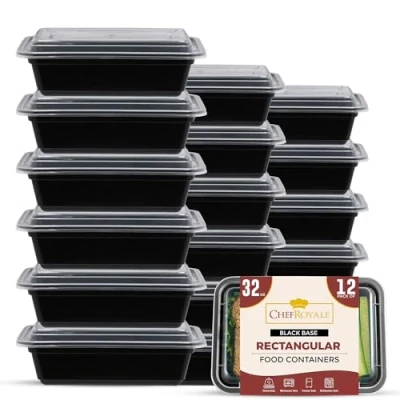 CHEF ROYALE 12pcs x 32oz Rectangular Black Base Meal Prep Containers BPA Free Storage with Airtight Lids Microwave, Dishwasher Safe Stackable Lunch Boxes Reusable
