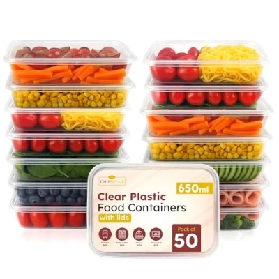 CHEF ROYALE Food Storage Container with Lids 50 x 650ml Plastic Prep Takeaway Airtight Microwave, Freezer & Dishwasher Safe Ideal for Recyclable (50, 650ml)