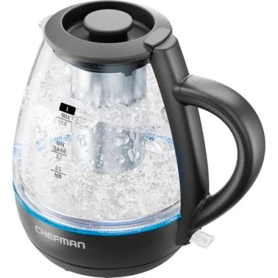 FAST BOILING: Experience rapid boiling with this 1500W electric kettle. Get hot water in as little as 3 minutes, perfect for making tea, coffee and other hot beverages efficiently. COMPACT AND EFFICIENT: Opt for a small electric kettle with a 1-litre capacity. Ideal for limited spaces and travel, ensuring quick hot water without occupying excess space. REMOVABLE TEA INFUSER: Utilize the included infuser to steep loose-leaf tea directly in this hot water kettle. Brew a whole pot and serve multiple people with both efficiency and ease. SAFETY ASSURED: Ensure safe and worry-free boiling with the automatic shutoff and boil-dry protection in this hot water kettle electric. LED INDICATOR LIGHTS: Blue LED lights illuminate during heating and turn off when it reaches the boil, providing clear visibility and assurance of the water warming process in this electric tea kettle., Manufacturer: Chefman
