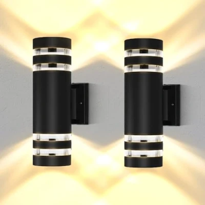 EXCEPTIONAL ILLUMINATION: Contemporary outdoor wall lights fixtures distribute light uniformly from both the upper and lower openings(No sensing function). This front door light features two warm GU10 LED bulbs, complemented by transparent shades at the top and bottom, providing a gentle, warm glow that enhances the sophistication and charm of your residence. QUALITY MATERIALS: This exquisite up and down lights outdoor is made of sturdy cast aluminium, with top and bottom rings designed in light-transmitting, UV-resistant acrylic.Its robust design enables it to withstand severe weather, resisting both rust and peeling paint for exceptional long-lasting performance. WATERPROOF OUTDOOR WALL LIGHT:Our outside wall light boast an IP44 protection class, making their power supply highly resistant to water and dust. This durability means they can adapt effectively to all types of weather. Suitable applications include outdoor gardens, porches, as well as indoor settings like bathrooms, corridors, kitchens, living rooms, dining areas, and bedrooms. Easy Installation: We provide you with all tools needed to mount this porch lights on the wall.Follow these steps:1. Remove the base from the led wall lights; 2. Fix the base to the wall; 3. Wiring; 4. Fix the lamp body to the base, and the installation can be completed. WHAT WE OFFER: You will receive a CE certified high quality exterior wall lights, 2 x 3000K GU10 bulbs, and mounting accessories. No matter what problems you encounter, please feel free to contact us, we are happy to serve you.