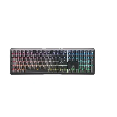 Wireless, rechargeable gaming keyboard: With an elegant aluminium housing and super-fast gaming mode (latency under 1 ms). Rechargeable even while playing! Absolutely flexible triple-mode connection: Bluetooth, 2.4 GHz RF and cable technology - operate several devices simultaneously and switch back and forth at the touch of a button High-quality mechanical CHERRY MX2A RED switches: Smooth and direct typing feel with linear switching characteristics (no click) and more than 100 million actuations per key Lebendige RGB-Hintergrundbeleuchtung mit über 16 Mio. Farben: Zahlreiche integrierte Farbspiele und Lichteffekte (Individuell einstellbar mit der CHERRY UTILITY Software) Useful gaming functions: Full N-key rollover (all keys are read out simultaneously), anti-ghosting (no incorrect entries), programmable keys + WIN key lock