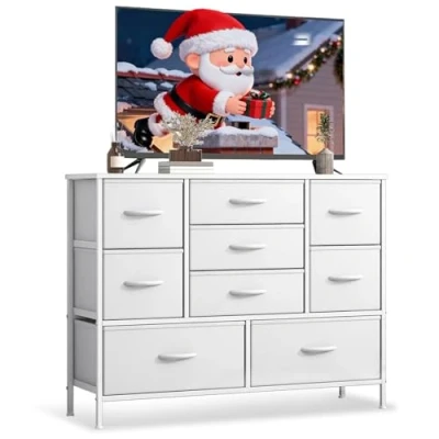 【Ample Storage Space】This Chest of Drawers is 39.4"L x 11.8"W x 29.9"H. It has 9 deep fabric drawers that you can remove, and a spacious wooden top. This makes it easy to store your entertainment equipment and daily items. The desktop provides display space for artwork, small ornaments and other accessories. 【Stable & Durable Dresser】The chest of drawers bedroom has been crafted with 15mm thickened metal steel frame and a water-resistant laminated MDF top, ensuring it will last for years. The strong steel bars stop the drawers from sagging over time, and the adjustable feet make sure the desk doesn't wobble on uneven floors. The anti-tip kit included with the product helps to prevent accidents and keep your family safe. 【Durable Quality Material】These drawers bedroom are made from strong non-woven fabric, which makes them long-lasting and easy to look after. You can clean them by wiping them with a damp cloth and then leaving them to dry. They are big enough to store lots of clothes, bedding and other household things, and they are easy to look after. 【Premium Details】The fabric chest of drawers has a smooth slide track and curved handles, so every push and pull is easy and smooth. The product has 4 adjustable feet, so it can be used on different types of ground. It is designed to protect floors from scratches, whether it is adjusted or cleaned, and it can be easily maintained, saving you time and effort. 【Multifunctional bedroom drawers】 This tall chest of drawers is a stylish and practical way to organize various spaces, such as closets, hallways, living rooms, bedrooms, offices, playrooms, and entryways. You can also use the drawer organizer as a TV stand. It has storage drawers that are perfect for everything you need to store and display in your home. 【Easy Assembly】This bedroom dresser comes with clear instructions, labelled parts, and all the necessary hardware. Assembly is quick and simple.It is easy enough to assemble on your own, even if you are alone.Our chest of drawers is packed in a sturdy package with thick foam and wooden sheeting to stop it getting damaged on the way to you.