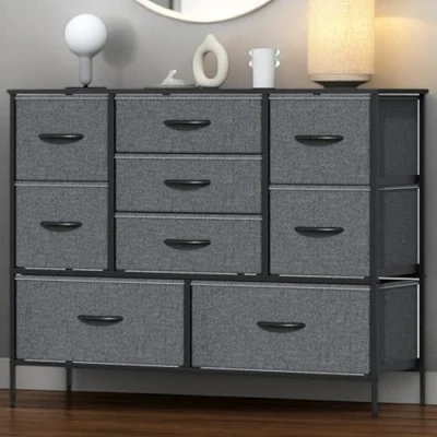 Spacious 9-Drawer Dresser: This chest of drawers features 9 deep removable drawers (2 large + 4 medium + 3 small) for organizing lingerie, blankets, kids’ clothes, accessories, linens and toys. Measuring 39.4"L x 11.8"W x 29.9"H, its slim, space-saving profile fits bedrooms, hallways, nurseries or dressing rooms, with a smooth top ideal for lamps, clocks and daily necessities. Versatile & Multifunctional bedroom drawers: This modern fabric drawers acts as a sleek, functional storage solution that seamlessly fits into closets, hallways, living rooms, bedrooms, offices, nurseries and entryways. The drawer organiser even doubles as a handy TV stand with storage drawers, maximizing utility to meet all your home storage and display needs. Durable & Safe Bedroom Storage Unit:Crafted with a reinforced metal frame and water-resistant laminated MDF top, this bedroom storage unit ensures long-lasting stability for daily use. Sturdy steel crossbars prevent drawer sagging over time, while adjustable feet keep it balanced on uneven floors and an included anti-tip kit eliminates accidents, safeguarding your family. Durable Breathable Fabric Dresser: Featuring breathable, premium non-woven fabric construction, these Storage Organizer Unit are built to last and simple to maintain—just wipe clean with a damp cloth and air dry. Perfect for a large chest of drawers, they offer generous storage space for stowing clothes, bedding, and household essentials, blending practicality with hassle-free upkeep. Easy Assembly bedroom drawers: This bedroom storage comes with clear instructions, an installation video, labeled parts, and all necessary hardware. Assembly is quick and simple—requiring only a few screws—and easy enough to complete independently, even for a single person.