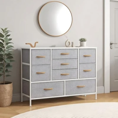 Spacious 9-Drawer Dresser: This chest of drawers features 9 deep removable drawers (2 large + 4 medium + 3 small) for organizing lingerie, blankets, kids’ clothes, accessories, linens and toys. Measuring 39.4"L x 11.8"W x 29.9"H, its slim, space-saving profile fits bedrooms, hallways, nurseries or dressing rooms, with a smooth top ideal for lamps, clocks and daily necessities. Versatile & Multifunctional bedroom drawers: This modern fabric drawers acts as a sleek, functional storage solution that seamlessly fits into closets, hallways, living rooms, bedrooms, offices, nurseries and entryways. The drawer organiser even doubles as a handy TV stand with storage drawers, maximizing utility to meet all your home storage and display needs. Durable & Safe Bedroom Storage Unit:Crafted with a reinforced metal frame and water-resistant laminated MDF top, this bedroom storage unit ensures long-lasting stability for daily use. Sturdy steel crossbars prevent drawer sagging over time, while adjustable feet keep it balanced on uneven floors and an included anti-tip kit eliminates accidents, safeguarding your family. Durable Breathable Fabric Dresser: Featuring breathable, premium non-woven fabric construction, these Storage Organizer Unit are built to last and simple to maintain—just wipe clean with a damp cloth and air dry. Perfect for a large chest of drawers, they offer generous storage space for stowing clothes, bedding, and household essentials, blending practicality with hassle-free upkeep. Easy Assembly bedroom drawers: This bedroom storage comes with clear instructions, an installation video, labeled parts, and all necessary hardware. Assembly is quick and simple—requiring only a few screws—and easy enough to complete independently, even for a single person.
