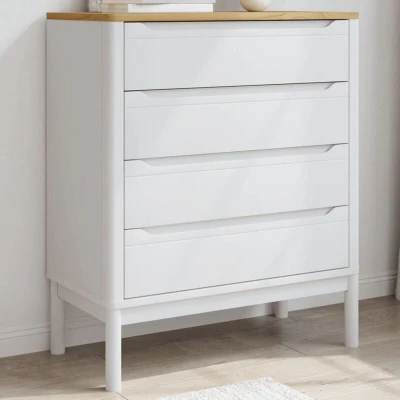 General description This classic chest of drawers features a timeless look, making it an excellent addition to your home. Made of solid pine wood, it is durable and sturdy, showcasing a beautiful natural material with a straight grain and rustic knots. The storage cabinet includes 4 drawers, providing ample space for organizing your daily essentials, while the top surface is perfect for displaying decorative items, photo albums, or small plants. The wooden legs enhance its natural appearance and ensure stability, allowing it to blend seamlessly with any interior decor. Technical specifications Colour: White Material: Solid pine wood Dimensions: 76.5 x 39 x 90.5 cm (W x D x H) Drawer size: 67.5 x 35 cm (W x D) Max. loading capacity: 20 kg Assembly required: Yes SKU: 374009 Other information Warning: To prevent it from tipping over, this product must be used with the wall attachment device (not provided). More details about preventing your furniture from tipping over can be found here .