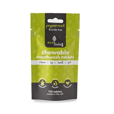 Packed in a resealable home compostable bag. Approximately 2 months supply for one person These mouthwash tablets, are 100% vegan and plastic free. Available in Fluoride-Free or Fluoride Dissolvable Mouthwash Tablets packed in a plant based, resealable home compostable pouch. Available in Fluoride-Free or Fluoride. ecoLiving a member of 1% For The Planet, donating a portion of profits to protecting our oceans from plastic pollution. ecoLiving is also in partnership with Eden Reforestation Projects, planting native trees to help stop climate change and reduce extreme poverty