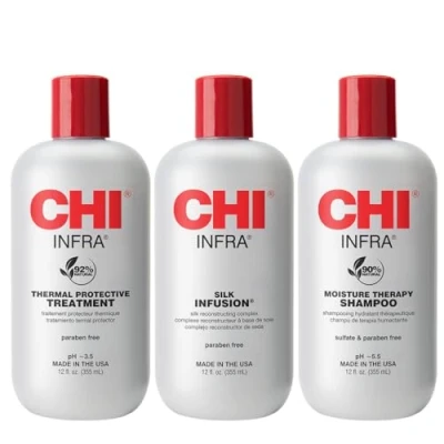 Moisture Balancing system offers complete scalp & hair care Contains CHI Infra Shampoo, CHI Infra Treatment, CHI Keratin Mist, and CHI Silk Infusion Positively charged silk molecules interlock into hair's natural structure to build strength and resilience and to improve moisture and shine Provides hair with strength, protection and softness CHI Cationic Hydration Interlink technolog, Protects hair from thermal styling