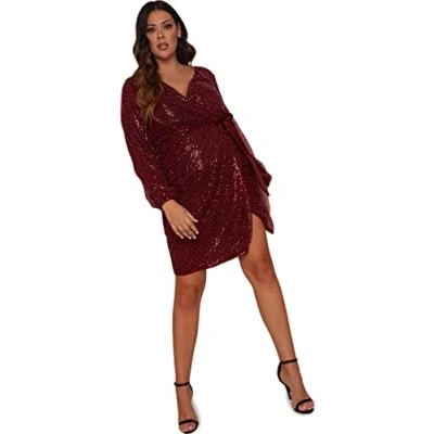Chi London Women's Plus Size Wrap Design Sequin Party Dress in Red Cocktail, Burgundy, 26