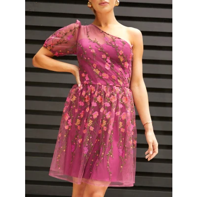 • 100% Polyester • Asymmetric neckline with a single puff sleeve. Embroidered mesh overlay enhances the feminine factor. A-line silhouette, nipped in from the waist and flared towards the hem