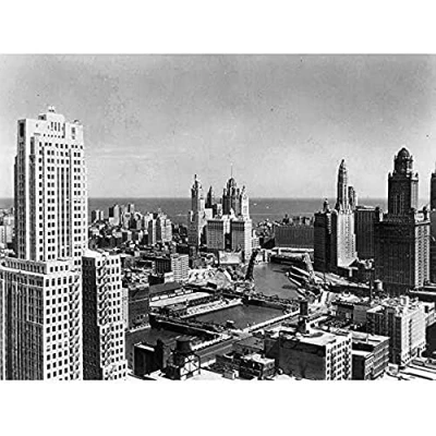 Chicago 1940er Skyline Toward Lake Michigan, Foto Kunstdruck, Leinwand, Premium Wanddekoration, Poster