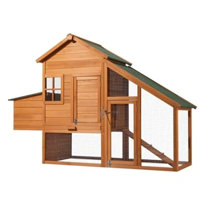 A shapely chicken coop with many extras Dimensions (LxWxH) 1720x660x1200mm Made of fir wood, with a slide out, galvanized mesh and tray Includes edge protection Stable and environmentally friendly