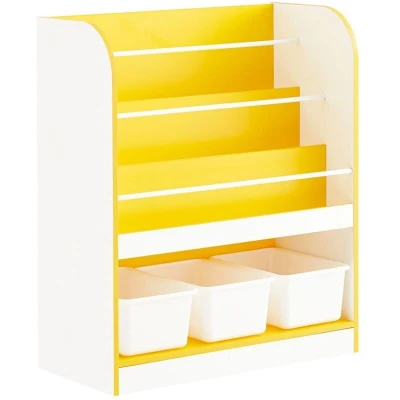 General description This modern design children bookcase will blend perfectly with any decor, keeping the children’s room nicely organized. The 3-tier shelves are ideal for storing books of varying sizes and thicknesses, while 3 metal round cross bars prevent the books from falling. Additionally, it includes 3 plastic boxes perfect for storing toys like blocks and Lego. This sturdy and stable bookcase is suitable for children ages 3 and up, helping them develop good organizing habits. It comes with an anti-tipping device to ensure great stability and safety, making it an ideal choice for daycare, classrooms, and children's rooms. Technical specifications Material: MDF with melamine veneer Dimensions: W63 x D30 x H76 cm Weight: 12.6 kg Load capacity: 21 kg Box material: Plastic Cross bar material: White powder-coated steel Installation Item comes in a flat pack and requires self-assembly Detailed instructions supplied Other information The decorative elements are not included in the