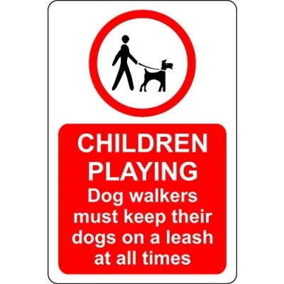 Children playing dog walkers must keep their dogs on a leash at all times Playground safety sign 1.2mm Rigid plastic 300mm x 200mm Digitally printed for extra durability Drill and screw in position or use double sided tape to mount onto suitable surface., Manufacturer: KPCM Display ltd
