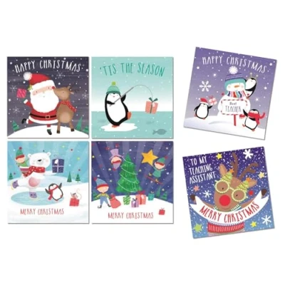 COMPLETE CLASSROOM PACK: Includes 32 festive cards with envelopes – 30 cards for classmates plus 1 special card for teacher and 1 for teaching assistant. FOUR FUN DESIGNS: Features Santa, polar bear, penguin and elf illustrations that children love, adding cheerful variety when handing out cards. PERFECT SIZE FOR KIDS: Compact 8cm x 8cm square cards fit easily into school bags, ideal for little hands to write and share. QUALITY CARDS & ENVELOPES: Made from durable card with smooth finish and supplied with white envelopes for a neat, ready-to-give presentation. SUITABLE FOR BOYS & GIRLS: Neutral, child-friendly designs ensure these Christmas cards are suitable for all classmates, friends and teachers. MAKE CHRISTMAS SPECIAL AT SCHOOL: A fun way for children to spread festive cheer, practice handwriting and share kindness with friends.
