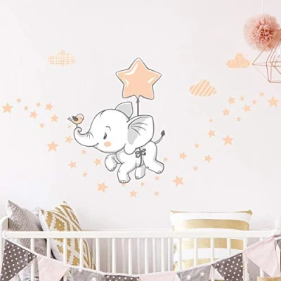 Children's Wall Stickers Baby Room Decoration Bedroom Sticker Elephant Happy in The Clouds + 120 Stars H40 x L30 cm