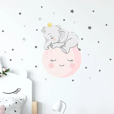 Children's Wall Stickers Baby Room Decoration Bedroom Sticker Elephant on The Moon and 30 Stars H40 x L30 cm