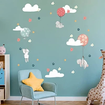 Children's Wall Stickers Baby Room Decoration Bedroom Sticker Funny Rabbits and Flying Balloons H60 x L90 cm