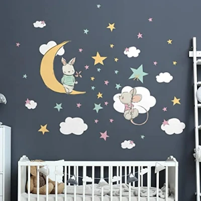 Children's Wall Stickers Baby Room Decoration Bedroom Sticker Rabbit and Mouse Questing for Stars Height 80 x Length 60 cm