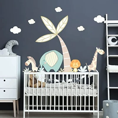 Package contents: The board measures H60 x L90 cm. The palm tree sticker measures H90 x L60 cm. The elephant sticker measures H30 x L35 cm. The giraffe sticker measures H40 x L30 cm. Easy to apply: The large thickness of the children's sticker makes it easy to apply. Allows precise installation of the sticker without the formation of air bubbles. Application is simple, simply peel off from the paper and lay on a smooth, clean surface. Peel off the sticker from the backing and apply from left to right. Repositioning is possible during the first few months. The sticker then holds permanently on your substrate, without damaging it when peeling off. Decorative element and easy to use: This children's animal wall sticker is perfect for your child's room. This wall sticker for children's room with animals adds a touch of design to your decoration. Simple and easy to install. Perfect gift: Give these wall stickers as a gift for special occasions: birthday parties, baby showers, Christmas, engagements, etc. ✅ DURABLE AND RESISTANT: Lasts more than 5 years. High quality photo prints, non-flammable, odourless, high temperature resistant (-40 to 85 °C), scratch and water resistant, no use of aggressive or abrasive products. Clean with fresh water., Manufacturer: Ambiance