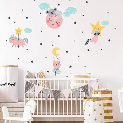 Package contents: The sheet measures H60 x L90 cm. The koala on the moon sticker measures H40 x L30 cm. The unicorn sticker with a star measures H40 x L35 cm. The rabbit with a moon sticker measures H50 x L15 cm. Easy to apply: The large thickness of the children's sticker makes it easy to apply. Allows precise installation of the sticker without the formation of air bubbles. Application is simple, simply peel off from the paper and lay on a smooth, clean surface. Peel off the sticker from the backing and apply from left to right. Repositioning is possible during the first few months. The sticker then holds permanently on your substrate, without damaging it when peeling off. Decorative element and easy to use: This children's animal wall sticker is perfect for your child's room. This wall sticker for children's room with animals adds a touch of design to your decoration. Simple and easy to install. Perfect gift: Give these wall stickers as a gift for special occasions: birthday parties, baby showers, Christmas, engagements, etc. ✅ DURABLE AND RESISTANT: Lasts more than 5 years. High quality photo prints, non-flammable, odourless, high temperature resistant (-40 to 85 °C), scratch and water resistant, no use of aggressive or abrasive products. Clean with fresh water., Manufacturer: Ambiance