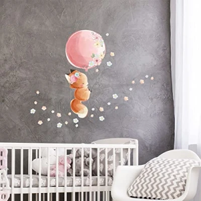 Children's Wall Stickers Baby Room Decoration Fox and Balloon Sticker + 60 Flowers Height 30 x Length 35 cm