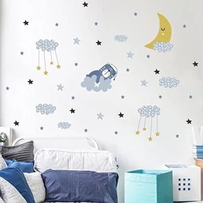 Children's Wall Stickers Baby Room Decoration Scandinavian Bear and Night Stars H60 x L90 cm