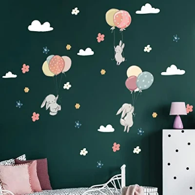 Children's Wall Stickers Baby Room Decoration Sticker Rabbits in The Sky and Flying Balloons H60 x L90 cm