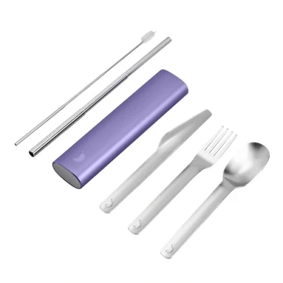 Chilly's Cutlery Stainless Steel Utensils with Aluminium Travel Case Knife, Fork, Spoon, & Straw Lavender