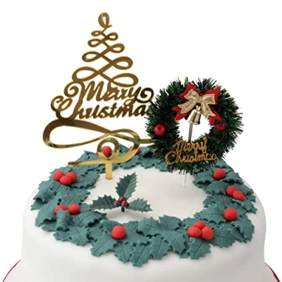 3pcs Christmas Cake Topper Decorations Set Consists of 1 x Wreath, 1 x Gold Merry Christmas Sign, 1 x Holly (NO Frill Included) Non Edible Cake Decoration Plastic Reusable Perfect For your festive holiday Cakes Lovely Addition to Snowy Scene Infuse your cakes with the spirit of Christmas, spreading joy and delight to all who gather around your festive treats., Manufacturer: Cake Factory