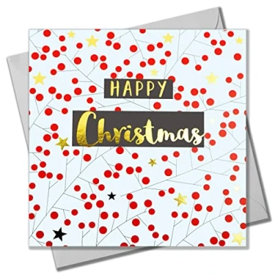 DIMENSIONS: 150x150mm CAPTION: Happy Christmas EMBELLISHMENT: Foil detail with Shiny Gold BLANK INSIDE: Space inside for your own message MADE IN THE UK: Designed, printed and finished in the UK HIGH-QUALITY: Printed on top quality heavy 350gsm card stock, with envelope included SUSTAINABLE: Comes wrapped in Compostable bag or with a card catch label. Both the greetings card & envelope are sustainably sourced and recyclable STANDARD LETTER SIZE: Can be sent with Royal Mail standard letter stamps