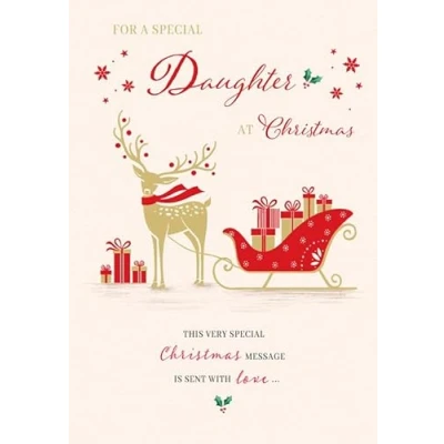 A High Quality Greeting Card and Envelope From Piccadilly Greetings Designed and made in the UK - supporting British jobs Caption: Daughter Description: Deer & sleigh Approximate size: 9 x 6 inches