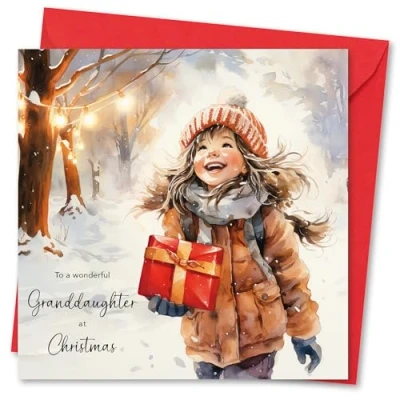 Christmas Card for Granddaughter. Girl with Gift Design. Eco Friendly & UK Made. Verse Inside. 148x148mm Size.