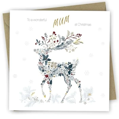 Christmas Card for Mum. Floral Stag Design with Gold Foil. 150 x 150mm, supplied envelope. Ecofriendly and Made in U.K.