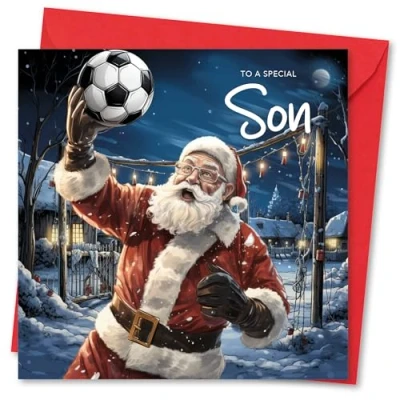Christmas card for Son. Goalie Design. Eco friendly & UK Made. Verse Inside. 148x148mm size.