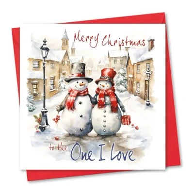 Christmas card for the One I Love. Mr and Mrs Snowman Design. Eco friendly & UK Made. Verse Inside. 148x148mm size.
