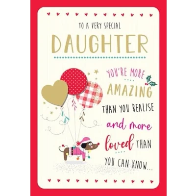 A High Quality Greeting Card and Envelope From Piccadilly Greetings Designed and made in the UK - supporting British jobs Caption: Daughter Description: Dog & gifts Approximate size: 9 x 6 inches