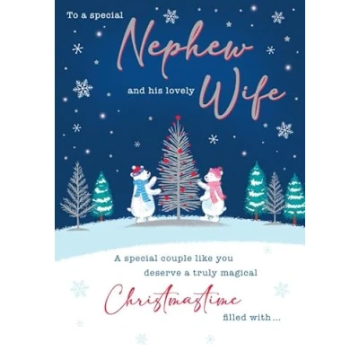Christmas Card, To a Special Nephew & Lovely Wife Bears tree Description 9 x 6 inches Piccadilly Greetings
