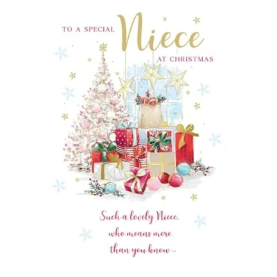 A High Quality Greeting Card and Envelope From Regal Publishing Designed and made in the UK - supporting British jobs Caption: Niece Description: Gifts & tree Approximate size: 9 x 6 inches