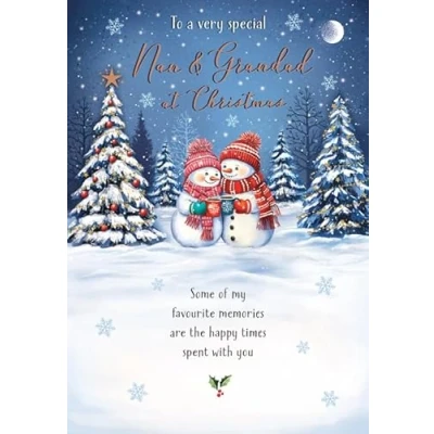 A High Quality Greeting Card and Envelope From Piccadilly Greetings Designed and made in the UK - supporting British jobs Caption: Nan & Grandad Description: Snowman couple Approximate size: 9 x 6 inches