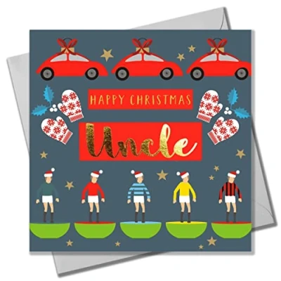 DIMENSIONS: 150x150mm CAPTION: Happy Christmas Uncle EMBELLISHMENT: Foil detail with Shiny Gold BLANK INSIDE: Space inside for your own message MADE IN THE UK: Designed, printed and finished in the UK HIGH-QUALITY: Printed on top quality heavy 350gsm card stock, with envelope included SUSTAINABLE: Comes wrapped in Compostable bag or with a card catch label. Both the greetings card & envelope are sustainably sourced and recyclable STANDARD LETTER SIZE: Can be sent with Royal Mail standard letter stamps