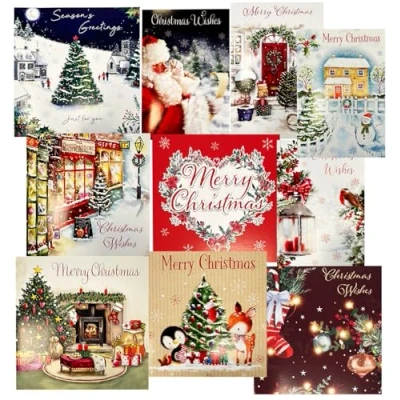 CHRISTMAS CARD MULTIPACK – Pack contains 50 Xmas Cards (10 designs x 5 of each). Each Christmas Card is supplied un-folded with matching envelopes CHRISTMAS CARDS FOR ALL – Christmas cards perfect for all your friends, family, work colleagues or customers MADE IN THE UK – Designed, printed and packed in the UK, our cards and packaging are made from board which is also manufactured in the UK. Cards are printed with Christmas Verse on inside FRIENDLY TO THE ENVIRONMENT:We only use card and envelopes which are fully recyclable.Environmentally Friendly Cards Made from sustainably sourced paper