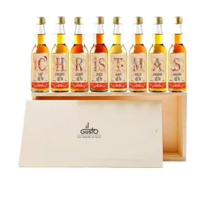 Eight Distinct Rum Flavours for an Unforgettable Tasting Experience: Each bottle in this set introduces a unique rum flavor, including Jamaican Rum (40%), Dominican Rum 8YO (40%), Coconut Rum (20%), Mango Rum (21%), Vanilla Rum (25%), Spiced Rum (40%), Lime Rum (20%), and Pineapple Rum (20%). The diversity in taste profiles offers a journey across tropical and classic rum flavors, perfect for a Christmas treat. Thoughtful and Festive ‘Merry Christmas’ Presentation: The miniature bottles are arranged in the gift box to spell out "Merry Christmas," making it a memorable gift. This unique design adds a festive touch, making it an ideal choice for holiday gifting and a centerpiece for any Christmas gathering. Exceptional Quality from Rum-Producing Regions Around the World: Each rum in this tasting set is sourced from high-quality rum-producing regions, ensuring an authentic tasting experience. From the rich flavors of aged Dominican rum to the tropical notes in Pineapple and Mango rum, this set showcases a diverse selection of global rum styles. Perfect Holiday Gift for Rum Lovers: Designed for rum enthusiasts, this gift set invites you to explore various expressions and styles of rum in one convenient collection. The creative "Merry Christmas" arrangement and premium flavors make it the ultimate holiday gift for friends, family, or colleagues. Eight 40ml bottles of premium rums, containing each of the following, Jamaican Rum (40%), Dominican Rum 8YO (40%), Coconut Rum (20%), Mango Rum (21%), Vanilla Rum (25%), Spiced Rum (40%), Lime Rum (20%), Pineapple Rum (20%) Perfect for Holiday Parties or Personal Enjoyment: This versatile rum tasting set is designed for both gifting and personal enjoyment. Whether as a host gift, for a family gathering, or for your own holiday tasting, it’s a thoughtful choice that’s sure to bring joy this season. High-Quality Glass Bottles for a Luxury Tasting Experience: Each 40ml bottle is crafted from durable, high-quality glass, adding a luxurious feel to this tasting set. The glass bottles are not only elegant but also perfect for displaying, making this a collectible set that any rum lover will cherish. Explore a Variety of Rum Flavours from Classic to Exotic: Enjoy the rich, aged flavors of Dominican Rum 8YO and Spiced Rum, as well as exotic, tropical options like Coconut Rum and Lime Rum. This set provides a full spectrum of flavors, from traditional to tropical, for a well-rounded rum tasting experience. Beautifully Packaged for Christmas Gift-Giving: Presented in a Beautifully arranged in your choice of an elegant printed or wooden presentation box, this rum set is designed for gifting. The festive packaging and high-quality presentation make it a thoughtful and sophisticated gift option for Christmas, creating a memorable unboxing experience. Ideal for a Christmas Tasting Experience at Home: This miniature rum set brings the tasting room experience home, making it perfect for a cozy Christmas night or to share with friends during the holiday season. It’s a convenient way to enjoy a variety of rum flavors without committing to full-sized bottles.