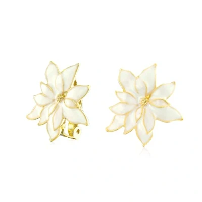 Christmas Party White Enamel Statement Flower Shape Poinsettia Clip On Earrings for Women with Non Pierced Ears Gold Plated Edge