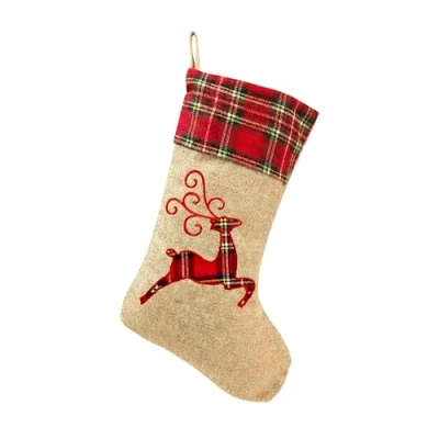ManoManoGeneral description Large Christmas stockings featuring a festive reindeer design, made from durable burlap hessian linen. These stockings are perfect for hanging as part of your holiday decorations, adding a charming touch to your home during the festive season. Technical specifications Dimensions: 26 x 45 cm Material: Burlap hessian linen