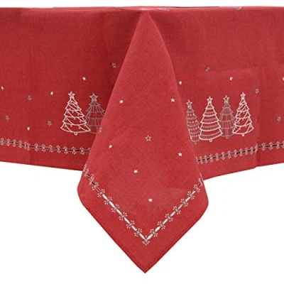 Luxury fabric Christmas Tablecloths and Napkins (sold separately) Red fabric with silver/white embroidered Christmas trees and stars Tablecloths available in 3 sizes Napkins come in a pack of 4 100% polyester. Machine washable